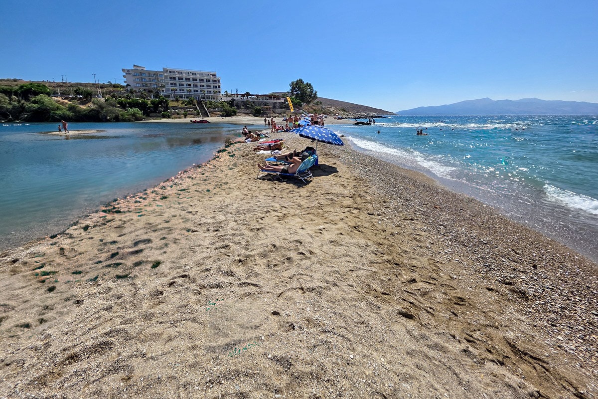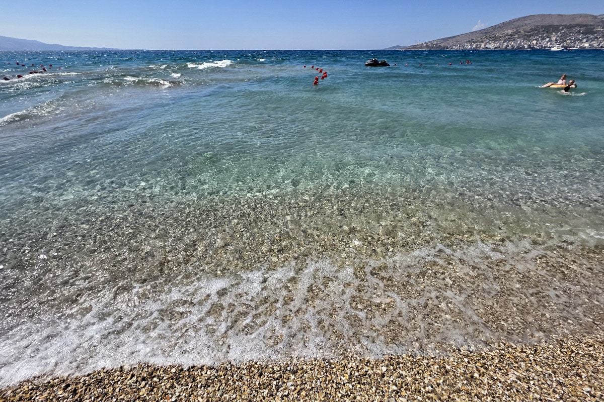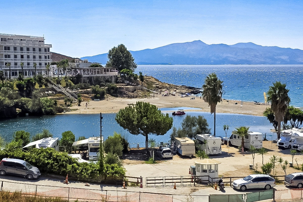 Ce qui rend Mango Beach unique à mes yeux, c’est la qualité de son environnement. La plage est bordée d’un petit cordon végétal, de quelques arbres et palmiers, et surtout, elle bénéficie d’une eau cristalline qui change de couleur au gré du soleil et du vent. Les paysages alentours sont superbes : on aperçoit la ville de Saranda à l’horizon, les montagnes de Corfou et les collines environnantes. La luminosité, le contraste entre la plage, l’étang d’eau douce, et la mer créent un décor naturel dont on ne se lasse pas. À savoir : l’eau est un peu plus fraiche ici à cause de la rivière.