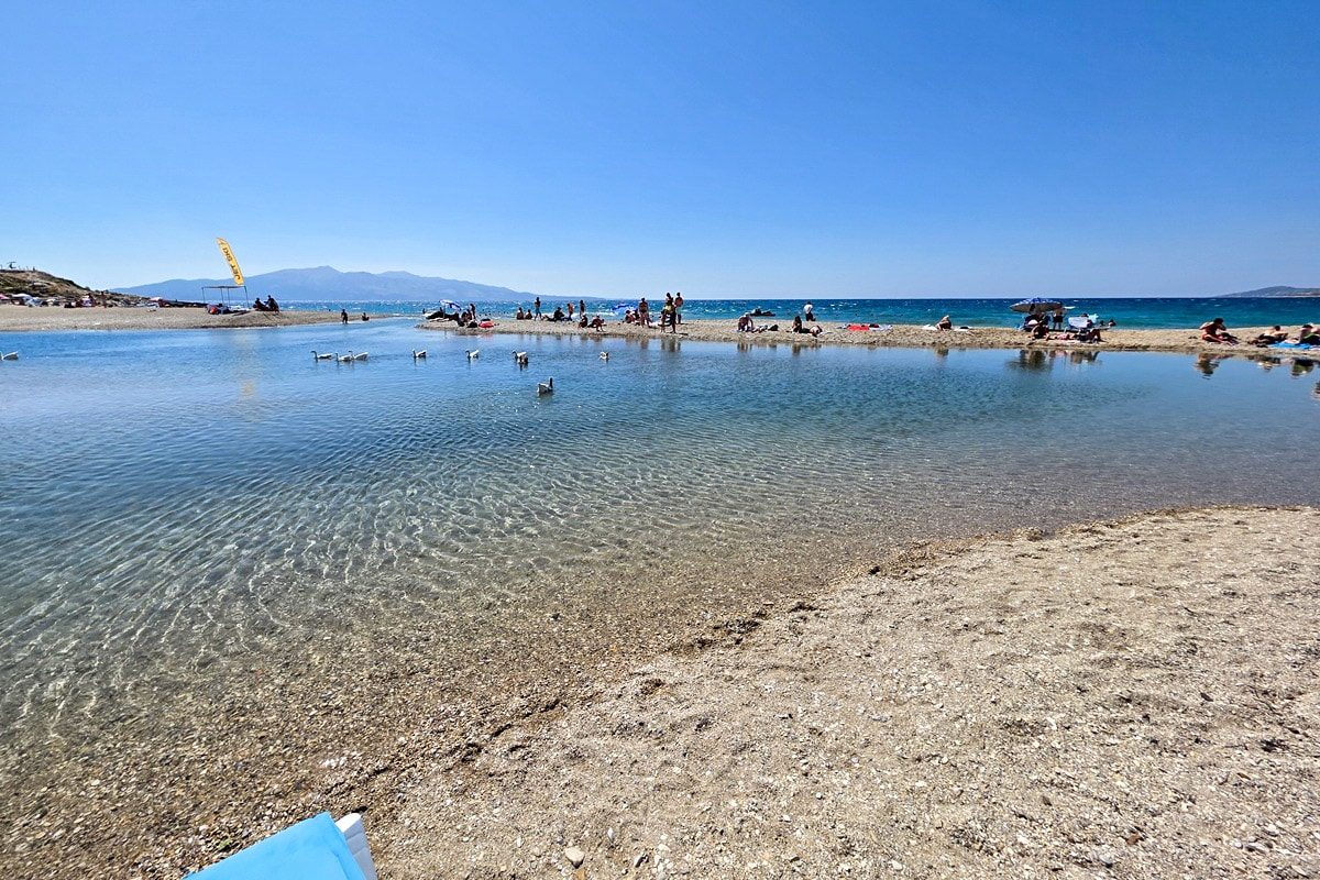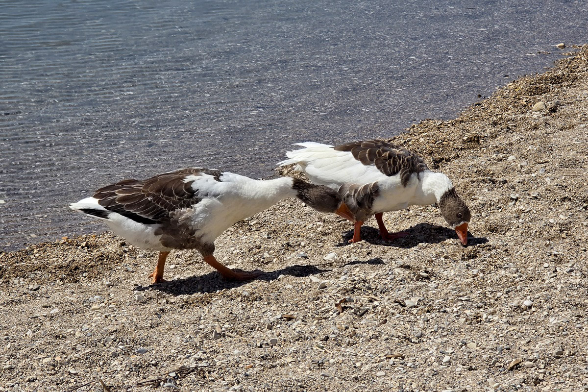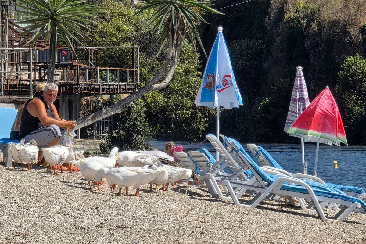 Cest la présence d’une petite rivière qui se jette dans la mer qui forme cet étang derrière la bande de plage principale. Ce point d’eau douce crée une zone lagunaire surprenante, fréquentée… par des oies ! On peut les observer de très près alors qu’elles picorent sur la plage ou barbotent dans l’eau claire du bassin. Ce détail insolite amuse les petits et les grands, et donne un caractère singulier à Mango Beach : je n’ai jamais vu ce type de scène ailleurs à Saranda.